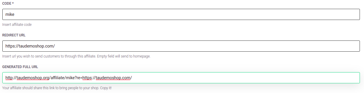 To get started, enter your partner's name and email. The important field is CODE and you enter it below the basic data, which does not necessarily have to be a number, but you can also enter a name. The next field is a link on your site, to which you want potential customers to be redirected.