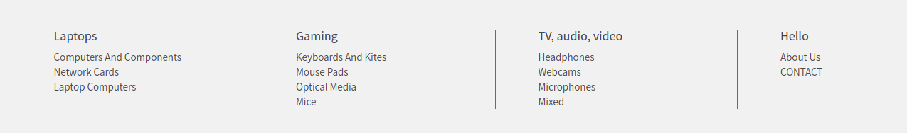 The navigation at the bottom of the site can contain two levels of depth. It is recommended that you add your main categories and links to the header menu to help your customers navigate through your store. Basically the navigation below contains links for additional shipping information, billing details, blog and contact details.