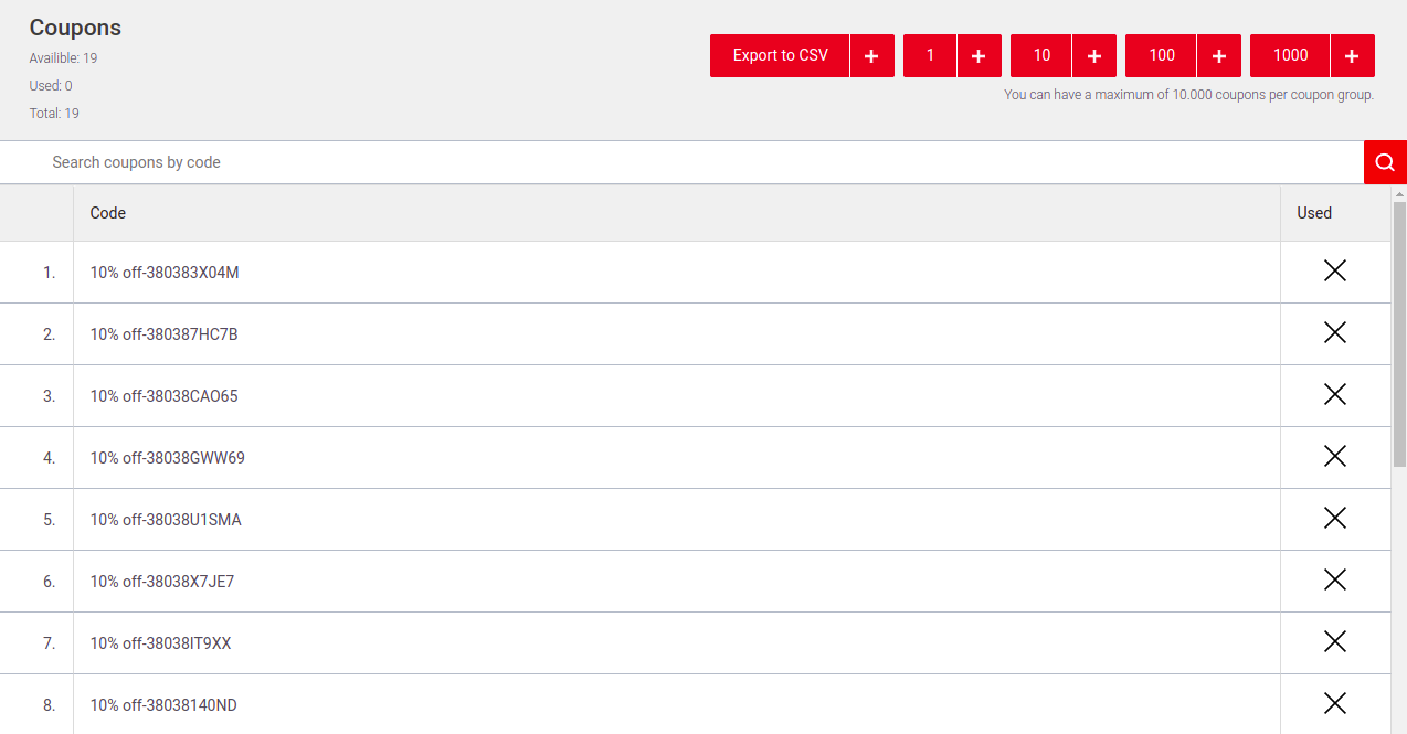 Single coupon are one-time coupons that can only be use once. groups can also be defined as percent or fixed amount. Each coupon from that group will inherit its coupon group value. Each group should have a prefix defined as it will help you differentiate coupons from one another. Prefix is added to each coupon in format “PREFIX-COUPONCODE”. You need to enter the coupon number you want. After entering all the necessary data, it is necessary to confirm by generating a coupon (by clicking on "generate"), after which the entire list of all coupons will be displayed (picture). You can then pass it on to your potential customers for use.