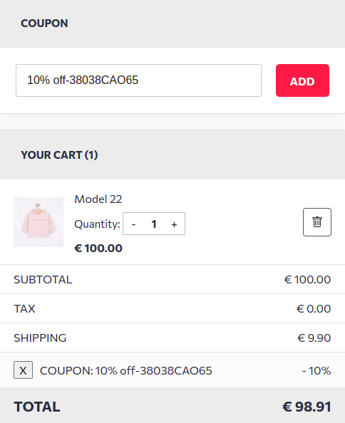 Please keep in mind that one coupon can be applied to one cart only and the coupon can not bring the total to 0. If a customer changes its cart so that the coupon covers the entire payment coupon will be automatically removed from the cart.Note: When you have finished creating the coupon, you need to enable the coupons in the Settings -> General. The customer enters the name of the coupon at the checkout, where he enters his data and information on delivery / payment. The coupon is immediately applied with the final price displayed (picture).